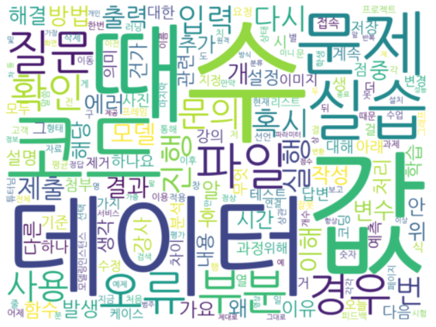 만들고 나니 뿌듯했던 Word Cloud XD 등장한 단어의 빈도수를 시각화 한 그림이다! 전체적인 문의 내용에는 다음과 같은 단어들이 가장 빈번하게 나온다. 딱 봐도 값, 수, 코드, 파일, 실습, 함수 이런 단어들이 눈에 잘 띄는 것 같다!