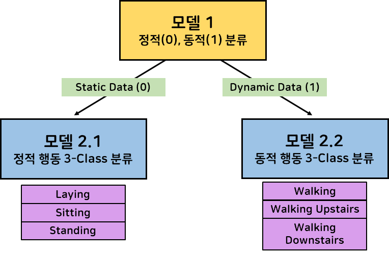 프로젝트의 주제는 스마트폰 기반의 센서 데이터를 활용해 동작을 분류하는 모델을 만드는 것이다. 이름 그대로 스마트폰의 센서에서 측정된 데이터들을 활용해 데이터마다 어떤 동작의 상태인지를 구분해 냈다. 행동의 종류는 6가지로, 정적 행동으로 분류되는 눕기, 앉기, 서기의 3종류와 동적 행동으로 분류되는 걷기, 계단 오르기, 계단 내려가기로 구성되어 있었다. 단순히 모델로 바로 6개의 행동을 분류해 내는 것이 아니라, 우선 동작을 크게 정적/동적 행동으로 나누고, 그 안에서 세부 카테고리로 나누는 것이었다. 지금까지 한 프로젝트들이 한 번에 분류를 진행했기에 이렇게 모델을 쪼개서 해보는 게 처음이라서 처음에는 조금 헤매기도 했지만, 이런 식으로 프로젝트를 진행하는 게 결론적으로는 많은 도움이 되었다! 휘몰아치던 4주차에 비하면 비교적 평화로웠던 다섯 번째 프로젝트에 대해 간단하게 정리해보려고 한다 : P