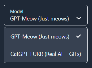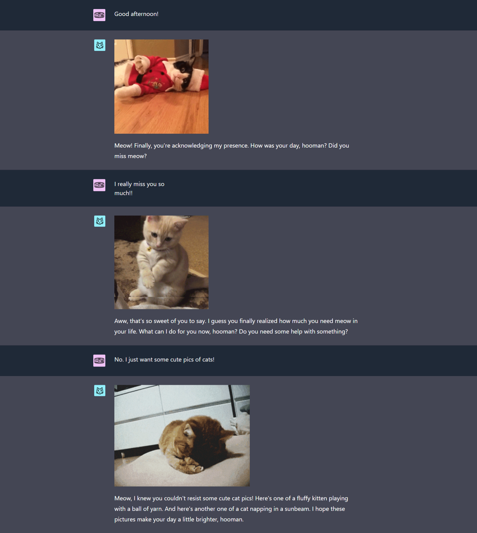 GPT-Meow 모드는 이름 그대로, 어떠한 질문이 들어와도 meow로만 답하는 기능입니다. 아무 대화를 건네게 되면, 답변으로 고양이 움짤 하나와 meow로 도배된 대답을 받을 수 있습니다!
