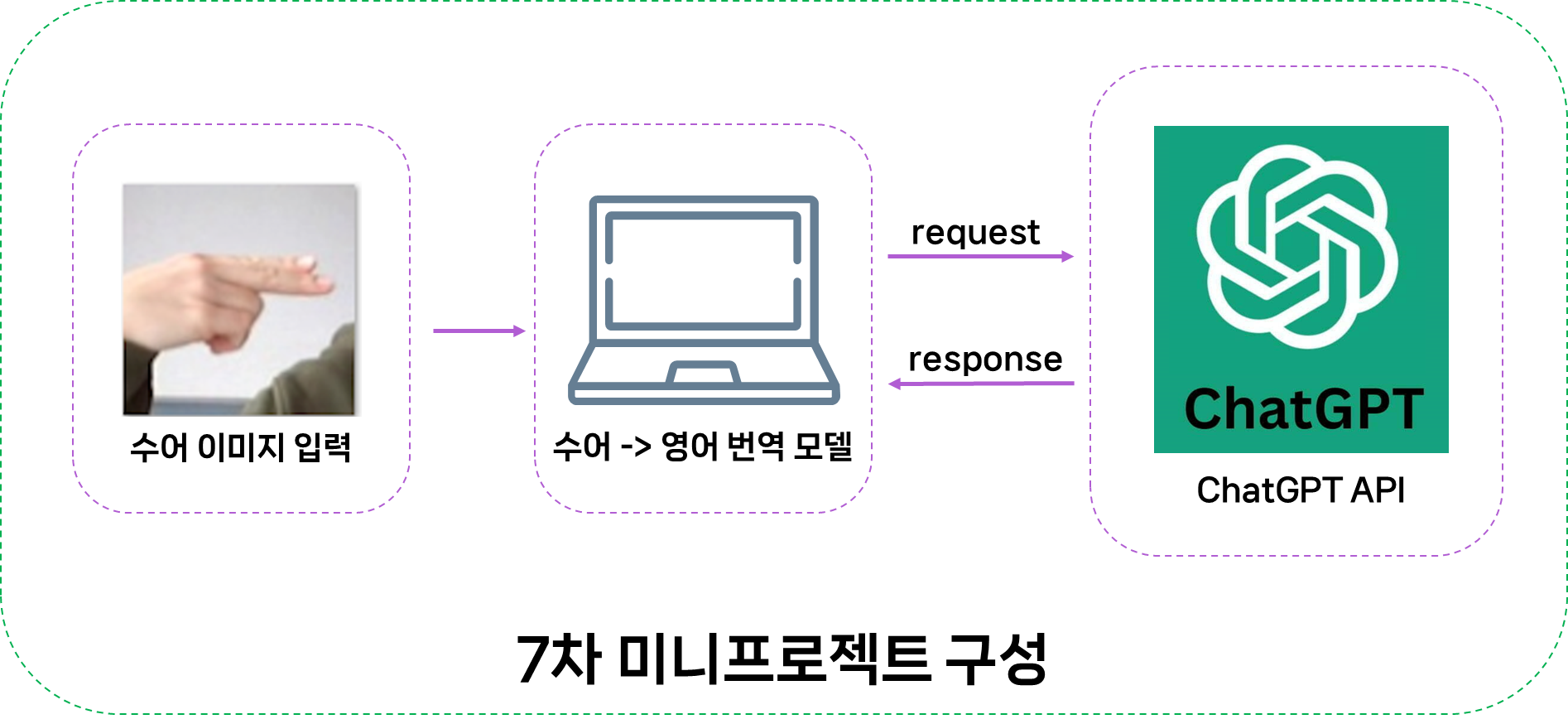 마지막 미니 프로젝트의 주제는 수어 이미지를 입력하면, 해당 이미지를 영어로 번역 후, ChapGPT에게 전달하여 응답을 받는 웹 서비스 구현이다. 이번에는 기존 프로젝트 진행 방식과는 많이 다르게 진행되었다!