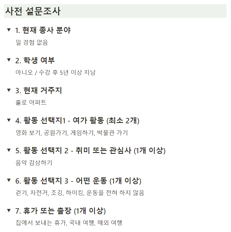 ④,⑤,⑥,⑦ : 이 문항들이 서베이의 핵심 항목들인데, 대부분의 강의에도 나와있듯이 선택하는 활동들의 결을 통일하면 준비할때도 굉장히 유용하다! 나 같은 경우에는 특히 6번에서 걷기, 조깅, 자전거 이런 식으로 묶어서 선택하고 집 근처 공원에서 걷기/조깅/자전거 타기 이렇게 한 번에 대답할 수 있을만한 시나리오를 생각해 뒀었다. 선택지에 정말 자신 있게 대답할 수 있는 항목이 있다면, 그걸 선택하는 것도 충분한 것 같다! 나는 4번 게임하기, 박물관 가기는 어떤 질문이 들어와도 받아칠 수 있을 것 같은 경험과 생각이 있어서 선택했다.(하지만 실제 시험에서는 안 나왔다.)