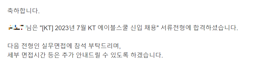 에이블스쿨의 가장 큰 메리트라고도 할 수 있는 연계 채용 전형에 참여했다. 교육 입교 할 때만 해도 KT 입사에 대한 큰 기대는 없었는데, 수료 후 올라온 채용 공고를 보니까 심장이 두근두근 했다 ㅋㅋㅋ 사담은 여기까지 하고 연계 전형이 어떤 식으로 진행되었는지 간단히 작성해 보겠다.