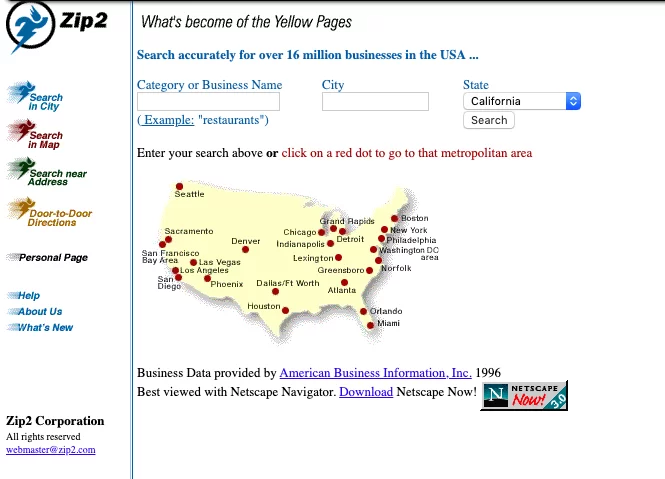 Zip2는 일론 머스크가 1995년에 처음으로 창업한 회사로, 원래 이름은 Global Link Information Network였습니다. 이 회사는 온라인 도시 안내 소프트웨어를 개발하고 제공하였습니다. 1990년대생인 저는 어렸을때 동네 가게들의 전화번호가 모두 적혀있는 두꺼운 전화번호부를 봤던 기억이 어렴풋이 있는데요, 미국도 이와 동일한 비즈니스 전화번호부가 존재했고 이를 yellow pages라고 불렀습니다. zip2는 이런 yellow pages를 온라인으로 이용할 수 있는 서비스를 제공했습니다. 1999년도에 이 회사는 미국의 컴퓨터 회사인 Compaq에 약 3억 달러로 회사를 매각하였습니다.