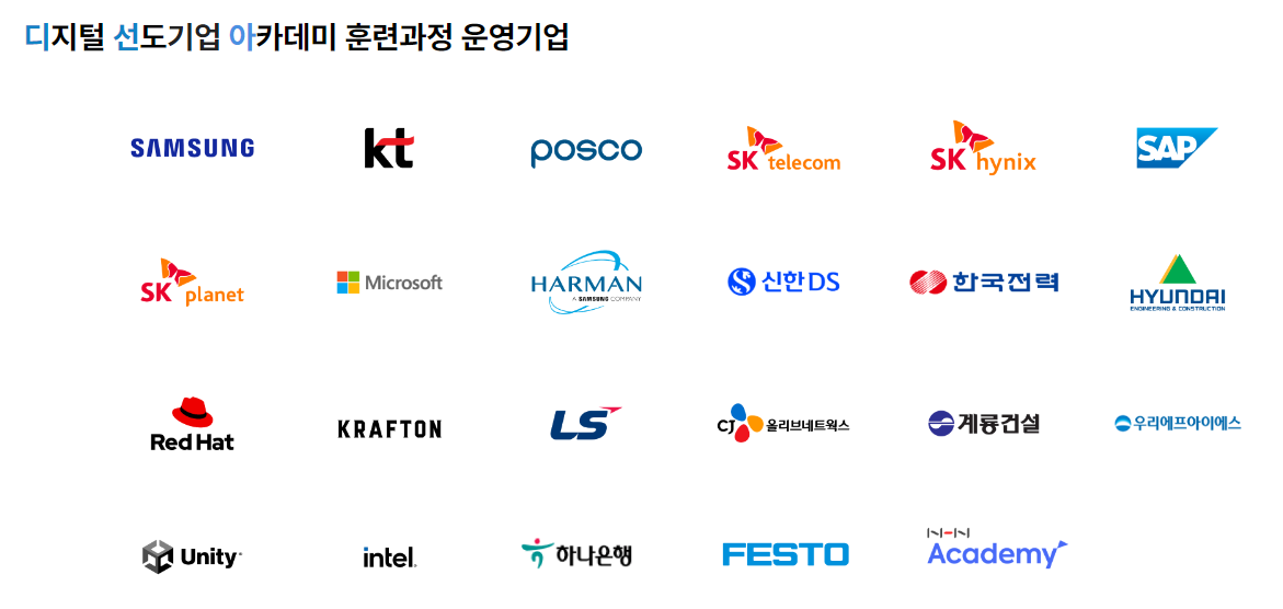 디지털 선도기업 아카데미의 훈련 과정들도 K-DT 프로그램에 포함되는 사업입니다. 디지털 선도기업 아카데미는 대한상공회의소, 고용노동부와 국내 최고의 기업이 함께하는 민·관 협력 교육 기관으로 각 기업이 직접 교육을 설계하고 참여할 뿐만 아니라 기업의 자원(시설, 장비, 플랫폼, 데이터 등)을 활용한 실무형 프로젝트 수업을 지향하여 첨단·디지털 분야의 미래산업 인재를 육성하는 교육을 수행하고 있습니다. 현재 이 훈련과정을 운영하고 있는 기업은 다음과 같습니다.