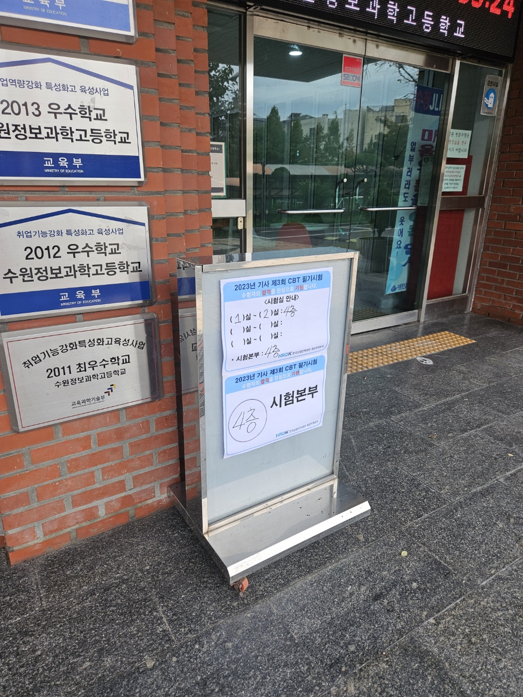 그리고 시험 당일날 내가 신청한 고사장으로 갔다. 나는 수원정보과학고등학교에서 응시했는데, 학교에 도착하게 되면 주변 사람들을 쭉 따라서 한 건물로 입실했다. 건물 내에 어디로 가면 되는지 종이로 안내가 다 되어 있어서 쉽게 따라갈 수 있었다.