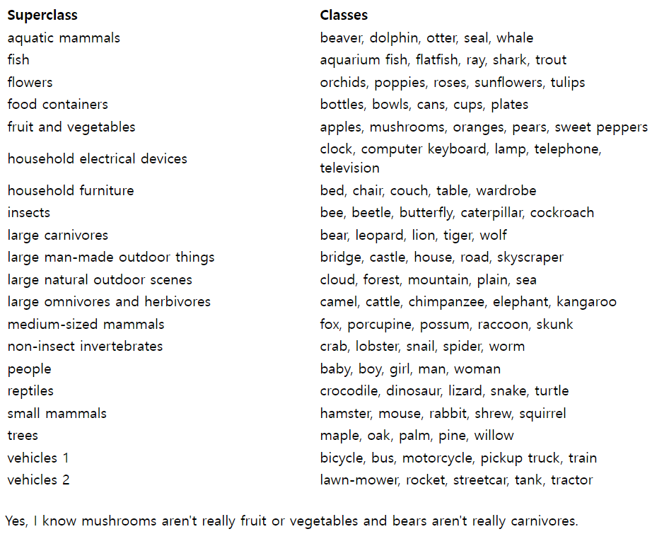 CIFAR-100은 100개의 클래스로 구분된 60,000장의 사물 이미지를 가진 데이터셋이다. 100개의 클래스는 20개의 상위 클래스로 묶을 수 있다.