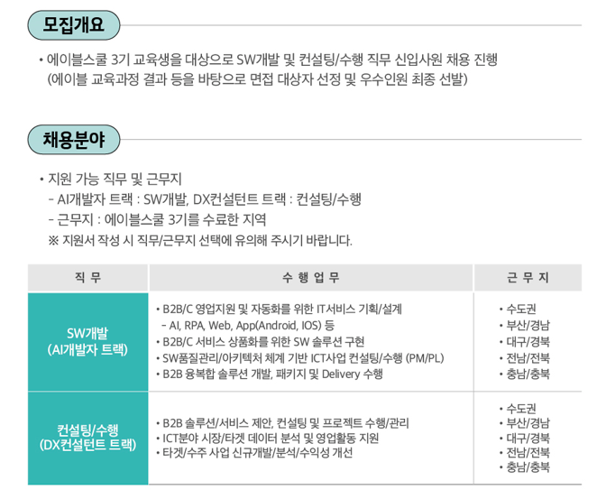 에이블스쿨 전형은 교육생들을 대상으로만 진행하는 연계 채용 전형으로, 위처럼 채용 분야는 트랙에 따라 나뉘어 있다. 직무 내용이나 근무지는 매 기수마다 달랐는데, 이번 기수에는 위와 같이 공고되었었다.